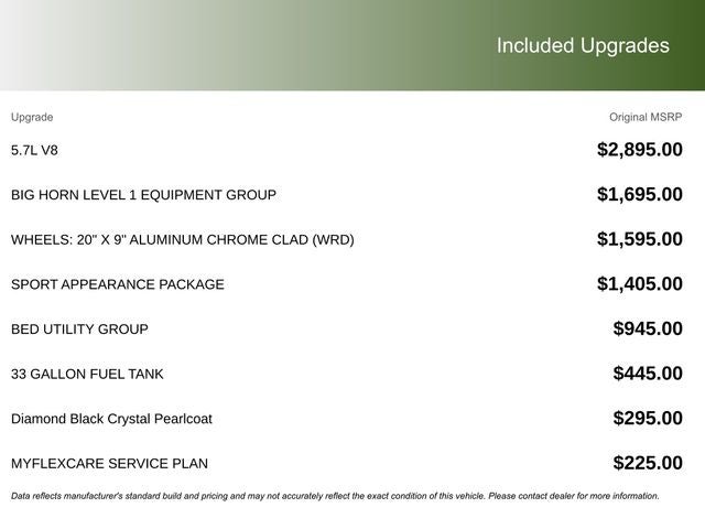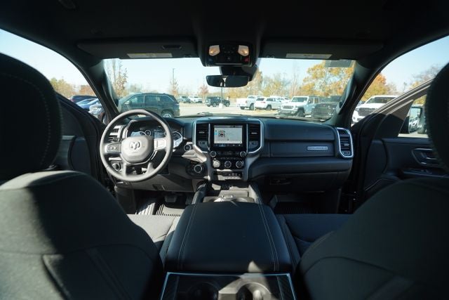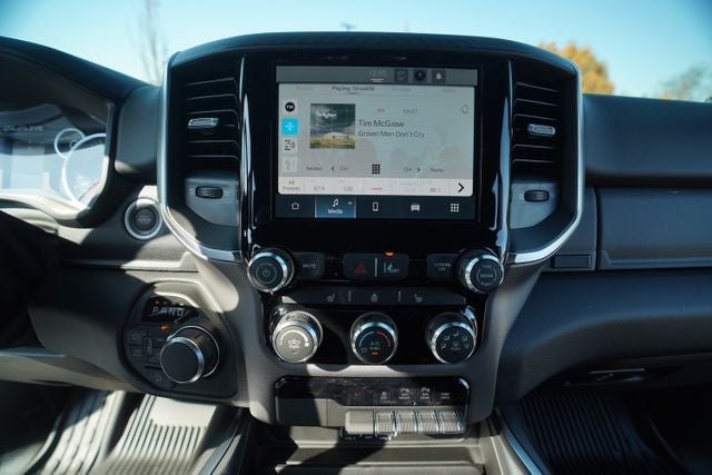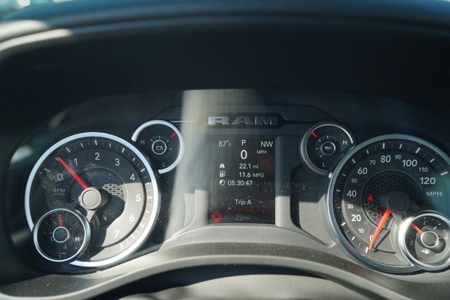 This vehicle comes with the following features and options:Bed Utility Group (Exterior 115V AC Outlet, MOPAR 4 Adjustable Cargo Tie-Down Hooks, MOPAR Spray in Bedliner, and Pick-Up Box Lighting), Big Horn Level 1 Equipment Group (115V Auxiliary Power Outlet, 2nd Row in Floor Storage Bins, 3 Rear Seat Head Restraints, 4 Way Front Headrests, 400W Inverter, Auto Power-Folding Mirrors, Auto-Dimming Exterior Driver Mirror, Auto-Dimming Rear-View Mirror, Black Exterior Mirrors, Black Premium Power Mirrors, Body Color Fender Flares, Bucket Seats, Center Console Parts Module, Convex Wide-Angle Exterior Mirror Insert, Deluxe Cloth Bucket Seats, Exterior Mirrors Courtesy Lamps, Exterior Mirrors with Heating Element, Exterior Mirrors with Supplemental Signals, Front Seat Back Map Pockets, Full Length Floor Console, Glove Box Lamp, Heated Front Seats, Heated Steering Wheel, Leather Wrapped Steering Wheel, Manual Adjust 4-Way Front Passenger Seat, Power 2-Way Driver Lumbar Adjust, Power Adjust 8-Way Driver Seat, Power Adjustable Pedals, Rear 60/40 Folding Seat, Rear Center Armrest, Rear Dome with on/Off Switch Lamp, Rear Power Sliding Window, Rear Window Defroster, SiriusXM Radio Service, SiriusXM Satellite Radio, Steering Wheel Mounted Audio Controls, Sun Visors with Illuminated Vanity Mirrors, and Universal Garage Door Opener), Quick Order Package 27Z Big Horn, Sport Appearance Package (Black Interior Accents, Body Color Door Handles, Body Color Front Bumper, Body Color Rear Bumper with Step Pads, Body Color Tailgate Handle, Grille Surround 1 Body Color Texture 1 Black, and RAM Grille Badge - Chrome), 33 Gallon Fuel Tank, 4-Wheel Disc Brakes, 48V Belt Starter Generator, 4G LTE Wi-Fi Hot Spot, 6 Speakers, ABS brakes, Air Conditioning, Alloy wheels, AM/FM radio, Apple CarPlay, Apple CarPlay/Android Auto, Auto High-beam Headlights, Brake assist, Bumpers: chrome, Cloth Bucket Seats, Compass, Connectivity - US/Canada, Delay-off headlights, Driver door bin, Dual front impact airbags, Dual front side impact airbags, Electronic Stability Control, Front anti-roll bar, Front Bucket Seats, Front Center Armrest w/Storage, Front fog lights, Front reading lights, Front wheel independent suspension, Fully automatic headlights, Global Telematics Box Module, Google Android Auto, GPS Antenna Input, Heated door mirrors, Illuminated entry, Integrated Center Stack Radio, Integrated Voice Command with Bluetooth®, Low tire pressure warning, Manual Adjust 4-Way Driver Seat, Manual Folding Exterior Mirrors, MOPAR Front and Rear Rubber Floor Mats, MyFlexCare Service Plan, Occupant sensing airbag, Outside temperature display, Overhead airbag, Overhead console, Panic alarm, ParkView Rear Back-Up Camera, Passenger door bin, Passenger vanity mirror, Power door mirrors, Power steering, Power windows, Radio data system, Radio: Uconnect 5 W with 8.4 Display, Rear anti-roll bar, Rear step bumper, Rear Wheelhouse Liners, Remote keyless entry, Speed control, Supplier Part Tracking (J-1), Tachometer, Telescoping steering wheel, Tilt steering wheel, Traction control, Trip computer, USB Host Flip, Variably intermittent wipers, Voltmeter, and Wheels: 20 x 9 Aluminum Chrome Clad.