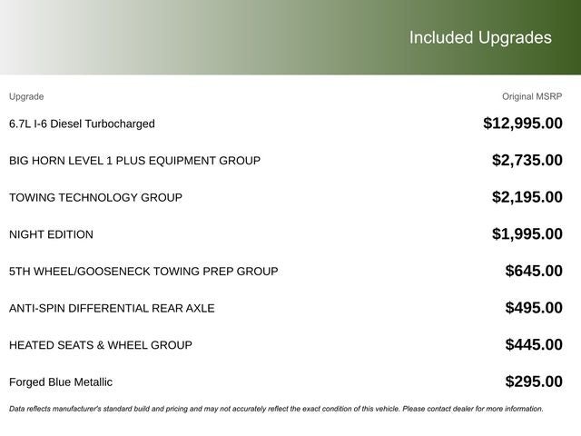 This vehicle comes with the following features and options:Big Horn Level 1 Plus Equipment Group (12 Touchscreen Display, 2 Way Rear Headrest Seat, 2nd Row in Floor Storage Bins, 4 Way Front Headrests, 40/20/40 Split Bench Seat, 4G LTE Wi-Fi Hot Spot, 9 Alpine Speakers with Subwoofer, Air Conditioning ATC with Dual Zone Control, Alexa Built-in, Anti-Spin Differential Rear Axle, Apple CarPlay, Auto Power-Folding Mirrors, Auto-Dimming Rear-View Mirror, Black Exterior Mirrors, Connected Travel and Traffic Services, Connectivity - US/Canada, Disassociated Touchscreen Display, Dual Glove Boxes, Emergency Vehicle Alert System (EVAS), Exterior Mirrors Courtesy Lamps, Exterior Mirrors with Heating Element, Exterior Mirrors with Supplemental Signals, Foam Bottle Insert (door Trim Panel), Folding Flat Load Floor Storage, Footwell Courtesy Lamp, For Details, Visit DriveUconnect.com, For More Info, Call 800-643-2112, Forward and Reverse Utility Lights, Front Armrest with Cupholders, Front Center Seat Cushion Storage, Front Seat Back Map Pockets, Global Telematics Box Module, Glove Box Lamp, Google Android Auto, GPS Antenna Input, GPS Navigation, HD Radio, Integrated Voice Command with Bluetooth®, LED Bed Lighting, Locking Lower Glove Box, Luxury Steering Wheel, Manual Adjust 4-Way Front Passenger Seat, Mirror Running Lights, MOPAR Deployable Bed Step, MOPAR Spray in Bedliner, Off-Road Info Pages, Power 2-Way Driver Lumbar Adjust, Power Adjust 8-Way Driver Seat, Power Adjust Mirrors, Power Heated Folding Telescopic Mirrors, Power Telescoping Mirrors, Power-Adjustable Convex Aux Mirrors, Premium Cloth 40/20/40 Bench Seat, Radio: Uconnect 5 Navigation with 12.0 Display, Rear 60/40 Folding Seat, Rear Dome with on/Off Switch Lamp, Remote Start System, Remote USB Port - Charge Only, Selectable Tire Fill Alert, SiriusXM Radio Service, SiriusXM with 360L, Steering Wheel Mounted Audio Controls, Storage Tray, and Trailer Tow Pages), Heated Seats and Wheel Group (Heated Front Seats and Heated Steering Wheel), Night Edition (Black Exterior Truck Badging, Black Interior Accents, Black Wheel Center Hub, Body Color Grille-Surround, Gloss Black Nostrils/Mic Black Grille, Painted Front Bumper, Painted Rear Bumper, and Wheels: 20 x 8.0 Black Painted Aluminum), Quick Order Package 24Z Big Horn, Towing Technology Group (Blind Spot and Cross Path Detection, Center Stop Lamp with Cargo View Camera, LED Tail Lamps, Red Tail Lamp Bezels, Surround View Camera System, Trailer Reverse Guidance, and Trailer Tire Pressure Monitoring System), 4-Wheel Disc Brakes, 5th Wheel/Gooseneck Towing Prep Group, 6 Speakers, ABS brakes, Air Conditioning, Alloy wheels, AM/FM radio: SiriusXM, Apple CarPlay/Android Auto, Brake assist, Bumpers: chrome, Center Hub, Clearance Lamps, Cloth 40/20/40 Bench Seat, Compass, Dash Pass Thru Wire Circuits, Delay-off headlights, Driver door bin, Dual front impact airbags, Dual front side impact airbags, Electronic Stability Control, Front anti-roll bar, Front Center Armrest w/Storage, Front fog lights, Front License Plate Bracket, Front reading lights, Fully automatic headlights, Heated door mirrors, Illuminated entry, Instrument Panel Mounted Auxiliary Switches, Low tire pressure warning, Manual Adjust 4-Way Driver Seat, MOPAR Front and Rear Rubber Floor Mats, Occupant sensing airbag, Outside temperature display, Overhead airbag, Overhead console, Panic alarm, ParkView Rear Back-Up Camera, Passenger door bin, Passenger vanity mirror, Power door mirrors, Power steering, Power windows, Radio data system, Radio: Uconnect 5 with 8.4 Display, Rear anti-roll bar, Rear Folding Seat, Rear seat center armrest, Rear step bumper, Rear window defroster, Remote keyless entry, Security system, Speed control, Tachometer, Tilt steering wheel, Traction Price includes: $1000 - 2026 National Bonus Cash . Exp. 02/02/2026 $1000 - 2026 Southwest BC Retail Bonus Cash . Exp. 02/0