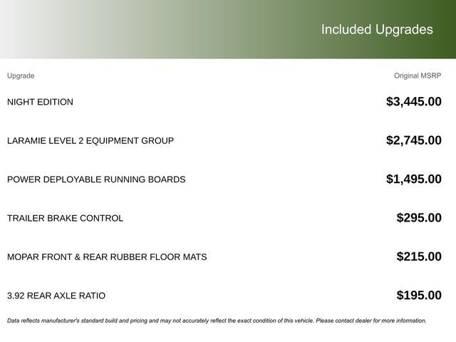 This vehicle comes with the following features and options:Laramie Level 2 Equipment Group (14.4 Touchscreen Display, 4G LTE Wi-Fi Hot Spot, Cluster 12 TFT Color Display, Connected Travel and Traffic Services, Connectivity - US/Canada, Front Passenger Interactive Display, GPS Navigation, Harman/Kardon 19 Speaker Premium Sound, Integrated Center Stack Radio, Integrated Voice Command with Bluetooth®, Power Tailgate, Radio: Uconnect 5 Nav with 14.4 Display, Rain Sensitive Windshield Wipers, SiriusXM Radio Service, SiriusXM with 360L, and USB Host Flip), Night Edition (Accent Color Door Handles, Accent Color Premium Power Mirrors, Accent Color Tailgate Handle, Anti-Spin Differential Rear Axle, Auto Power-Folding Mirrors, Auto-Dimming Exterior Driver Mirror, Black Exterior Truck Badging, Black Headlamp Bezels, Black Interior Accents, Black Painted Exterior Mirrors Caps, Black Tail Lamp Bezels, Body Color Front Bumper, Body Color Rear Bumper with Step Pads, Convex Wide-Angle Exterior Mirror Insert, Dual Exhaust with Black Tips, Exterior Mirrors Approach Lamps, Exterior Mirrors Courtesy Lamps, Exterior Mirrors with Heating Element, Exterior Mirrors with Memory, Exterior Mirrors with Supplemental Signals, Grille Surround 3 Black Texture 2 Black, Pirelli Brand Tires, Proximity Approach/Departure Lamps, RAM Grille Badge - Black, Sport Performance Hood, and Wheels: 22 x 9 Forged Aluminum), Quick Order Package 21H Laramie, 10 Speakers, 4-Wheel Disc Brakes, ABS brakes, Active Noise Control System, Adjustable pedals, Air Conditioning, Alloy wheels, AM/FM radio: SiriusXM with 360L, Apple CarPlay/Android Auto, Audio memory, Auto High-beam Headlights, Auto-dimming door mirrors, Auto-dimming Rear-View mirror, Automatic temperature control, Brake assist, Bumpers: chrome, Chrome Exterior Mirrors, Compass, Delay-off headlights, Driver door bin, Driver vanity mirror, Dual front impact airbags, Dual front side impact airbags, Electronic Stability Control, Front anti-roll bar, Front Bucket Seats, Front Center Armrest w/Storage, Front dual zone A/C, Front fog lights, Front reading lights, Front wheel independent suspension, Fully automatic headlights, Garage door transmitter, Heated door mirrors, Heated front seats, Heated rear seats, Heated steering wheel, Illuminated entry, Leather steering wheel, Leather Trimmed Bucket Seats, Low tire pressure warning, Manufacturer's Statement of Origin, Memory seat, MOPAR Front and Rear Rubber Floor Mats, Navigation System, Occupant sensing airbag, Off-Road Information Pages, Outside temperature display, Overhead airbag, Overhead console, Panic alarm, ParkView Rear Back-Up Camera, Passenger door bin, Passenger vanity mirror, Pedal memory, Power Deployable Running Boards, Power door mirrors, Power driver seat, Power passenger seat, Power steering, Power windows, Radio data system, Radio: Uconnect 5 Navigation with 12.0 Display, RAM Grille Badge - Chrome, Rear anti-roll bar, Rear reading lights, Rear seat center armrest, Rear step bumper, Remote keyless entry, Security system, Speed control, Split folding rear seat, Steering wheel mounted audio controls, Tachometer, Telescoping steering wheel, Tilt steering wheel, Traction control, Trailer Brake Control, Trip computer, Turn signal indicator mirrors, Variably intermittent wipers, Ventilated front seats, Voltmeter, and Wheels: 20 x 9 Premium Paint/Polish.