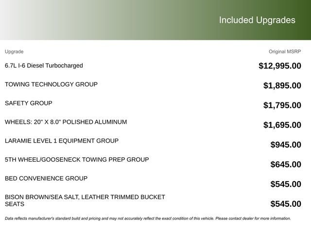 This vehicle comes with the following features and options:Bed Convenience Group (LED Bed Lighting and MOPAR Spray in Bedliner), Chrome Bumper Package (Bright Front Bumper and Bright Rear Bumper), Laramie Level 1 Equipment Group (2nd Row in Floor Storage Bins, Anti-Spin Differential Rear Axle, Auto Adjust in Reverse Exterior Mirrors, Auto Dim Exterior Mirror, Auto High Beam Headlamp Control, Auto Power-Folding Mirrors, Auto-Dimming Exterior Passenger Mirror, Chrome Exterior Mirrors, Exterior Mirrors Courtesy Lamps, Exterior Mirrors with Heating Element, Exterior Mirrors with Memory, Exterior Mirrors with Supplemental Signals, Foam Bottle Insert (door Trim Panel), Forward and Reverse Utility Lights, Mirror Running Lights, Power Adjust Mirrors, Power Adjustable Pedals with Memory, Power Heated Fold Telescopic Mirrors with Memory, Power Telescoping Mirrors, Power-Adjustable Convex Aux Mirrors, Rain Sensitive Windshield Wipers, and Remote Tailgate Release), Quick Order Package 24H Laramie, Safety Group (Active Lane Management System, Adaptive Steering System, Drowsy Driver Detection, and Traffic Sign Recognition), Towing Technology Group (Surround View Camera System, Trailer Reverse Guidance, and Trailer Tire Pressure Monitoring System), #1 Seat Foam Cushion, 10 Speakers, 115V Auxiliary Rear Power Outlet, 2 Way Rear Headrest Seat, 20 x 8.0 Polished Aluminum Wheels, 4 Way Front Headrests, 4-Wheel Disc Brakes, 4G LTE Wi-Fi Hot Spot, 5th Wheel/Gooseneck Towing Prep Group, ABS brakes, Air Conditioning, Alexa Built-in, Alloy wheels, AM/FM radio: SiriusXM with 360L, Apple CarPlay, Apple CarPlay/Android Auto, Auto-dimming Rear-View mirror, Automatic temperature control, Black Wheel Center Hub, Brake assist, Bumpers: body-color, Center Hub, Center Stop Lamp with Cargo View Camera, Clearance Lamps, Compass, Connected Travel and Traffic Services, Connectivity - US/Canada, Dash Pass Thru Wire Circuits, Delay-off headlights, Disassociated Touchscreen Display, Driver door bin, Driver vanity mirror, Dual front impact airbags, Dual front side impact airbags, Electronic Stability Control, Emergency Vehicle Alert System (EVAS), Folding Flat Load Floor Storage, For Details, Visit DriveUconnect.com, For More Info, Call 800-643-2112, Front anti-roll bar, Front Center Armrest w/Storage, Front dual zone A/C, Front fog lights, Front reading lights, Front Seat Back Map Pockets, Fully automatic headlights, Garage door transmitter, Global Telematics Box Module, Google Android Auto, GPS Antenna Input, GPS Navigation, HD Radio, Heated door mirrors, Heated Front Seats, Heated front seats, Heated Steering Wheel, Heated steering wheel, High Back Seats, Illuminated entry, Instrument Panel Mounted Auxiliary Switches, Integrated Voice Command with Bluetooth®, Leather Trim 40/20/40 Bench Seat, Low tire pressure warning, Navigation System, Occupant sensing airbag, Off-Road Info Pages, Outside temperature display, Overhead airbag, Overhead console, Panic alarm, ParkView Rear Back-Up Camera, Passenger door bin, Passenger vanity mirror, Power 2-Way Driver Lumbar Adjust, Power 2-Way Passenger Lumbar Adjust, Power Adjust 8-Way Driver Seat, Power Adjust 8-Way Front Passenger Seat, Power door mirrors, Power driver seat, Power passenger seat, Power steering, Power windows, Radio data system, Radio: Uconnect 5 Navigation with 12.0 Display, Rear 60/40 Folding Seat, Rear anti-roll bar, Rear reading lights, Rear seat center armrest, Rear step bumper, Rear window defroster, Remote keyless entry, Security system, Selectable Tire Fill Alert, SiriusXM Radio Service, SiriusXM with 360L, Speed control, Split folding rear seat, Steering wheel mounted audio controls, Tachometer, Tilt steering wheel, Traction control, Trailer Tow Pages, Trip computer, Turn signal indicator m Price includes: $1000 - 2026 National Bonus Cash . Exp. 02/02/2026 $2000 - 2026 National Select Inventory Bonus Cash. Exp. 02/0