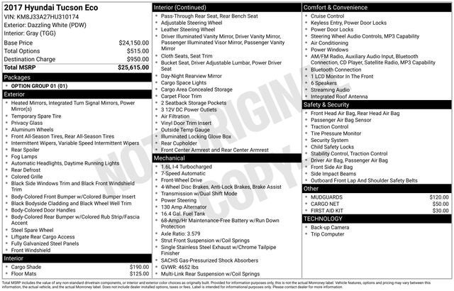 Dazzling White 2017 Hyundai Tucson Eco FWD 7-Speed Automatic 1.6L I4 DGI Turbocharged DOHC 16V ULEV II 175hp WE DELIVER ANYWHERE, 17 Alloy Wheels, 4-Wheel Disc Brakes, 6 Speakers, ABS brakes, Air Conditioning, Alloy wheels, AM/FM radio: SiriusXM, AM/FM/CD/MP3 Audio System, Axle Ratio: 3.579, Brake assist, Bumpers: body-color, Cargo Cover, Cargo Net, Carpeted Floor Mats, CD player, Delay-off headlights, Driver door bin, Driver vanity mirror, Dual front impact airbags, Dual front side impact airbags, Electronic Stability Control, Exterior Parking Camera Rear, First Aid Kit, Four wheel independent suspension, Front anti-roll bar, Front Bucket Seats, Front Bucket Seats w/Power Driver's Seat, Front Center Armrest, Front fog lights, Front reading lights, Fully automatic headlights, Heated door mirrors, Illuminated entry, Leather Shift Knob, Low tire pressure warning, Mudguards, Occupant sensing airbag, Option Group 01, Outside temperature display, Overhead airbag, Overhead console, Panic alarm, Passenger door bin, Passenger vanity mirror, Power door mirrors, Power driver seat, Power steering, Power windows, Rear anti-roll bar, Rear seat center armrest, Rear window defroster, Rear window wiper, Remote keyless entry, Roof rack: rails only, Security system, Speed control, Speed-sensing steering, Split folding rear seat, Spoiler, Steering wheel mounted audio controls, Tachometer, Telescoping steering wheel, Tilt steering wheel, Traction control, Trip computer, Turn signal indicator mirrors, Variably intermittent wipers, YES Essentials Cloth Seat Trim.