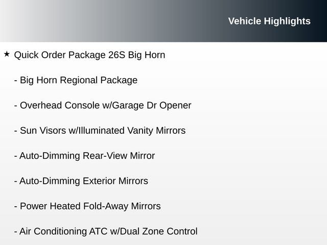This Big Horn also comes equipped with a host of advanced safety features, including a ParkView rear backup camera, electronic stability control, and a comprehensive airbag system. Whether you're hauling heavy loads or embarking on a weekend adventure, this truck is ready to rise to the occasion.