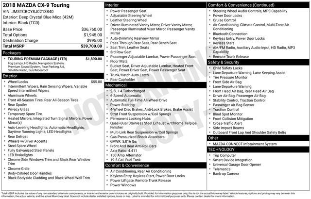 Deep Crystal Blue Mica 2018 Mazda CX-9 Touring 2.5L 4-Cylinder 6-Speed Automatic AWD