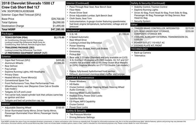 10-Way Power Driver's Seat Adjuster, 110-Volt AC Power Outlet, 150 Amp Alternator, 4-Wheel Disc Brakes, 4.2 Diagonal Color Display Driver Info Center, 40/20/40 Front Split Bench Seat, 6 Speaker Audio System, 6 Speakers, ABS brakes, Air Conditioning, Alloy wheels, AM/FM radio: SiriusXM, Auxiliary External Transmission Oil Cooler, Bluetooth® For Phone, Body Color Bodyside Moldings, Body-Color Door Handles, Body-Color Mirror Caps, Body-Color Power Adjustable Heated Outside Mirrors, Bodyside moldings, Brake assist, Bumpers: chrome, CD player, Chevrolet Connected Access, Chevrolet w/4G LTE, Chrome Grille Surround, Cloth Seat Trim, Color-Keyed Carpeting w/Rubberized Vinyl Floor Mats, Compass, Deep-Tinted Glass, Delay-off headlights, Driver & Front Passenger Illuminated Vanity Mirrors, Driver door bin, Driver vanity mirror, Dual front impact airbags, Dual front side impact airbags, Dual-Zone Automatic Climate Control, Electric Rear-Window Defogger, Electronic Stability Control, Exterior Parking Camera Rear, EZ Lift & Lower Tailgate, Front anti-roll bar, Front Center Armrest w/Storage, Front Chrome Bumper, Front License Plate Kit, Front reading lights, Front wheel independent suspension, Fully automatic headlights, HD Radio, Heated door mirrors, Heavy Duty Suspension, Heavy-Duty Rear Locking Differential, High-Intensity Discharge Headlights, Illuminated entry, Integrated Trailer Brake Controller, Leather Wrapped Steering Wheel w/Cruise Controls, Low tire pressure warning, Manual Tilt Wheel Steering Column, Manual Tilt/Telescoping Steering Column, Occupant sensing airbag, OnStar & Chevrolet Connected Services Capable, Outside temperature display, Overhead airbag, Overhead console, Panic alarm, Passenger door bin, Passenger vanity mirror, Power door mirrors, Power steering, Power windows, Power Windows w/Driver Express Up, Preferred Equipment Group 1LT, Premium audio system: Chevrolet MyLink, Radio data system, Radio: AM/FM 8 Diagonal Color Touch Screen, Rear 60/40 Folding Bench Seat (Folds Up), Rear Chrome Bumper, Rear reading lights, Rear seat center armrest, Rear step bumper, Rear Under-Seat Composite Storage Bin (LPO), Rear Wheelhouse Liners, Remote Keyless Entry, Remote keyless entry, Remote Locking Tailgate, Remote Vehicle Starter System, Single Slot CD/MP3 Player, SiriusXM Satellite Radio, Speed control, Speed-sensing steering, Split folding rear seat, Steering Wheel Audio Controls, Steering wheel mounted audio controls, Tachometer, Texas Edition, Texas Edition Badging, Theft Deterrent System (Unauthorized Entry), Thin Profile LED Fog Lamps, Tilt steering wheel, Traction control, Trailering Package, Trip computer, Variably intermittent wipers, Voltmeter, Wheels: 17 x 8 Bright Machined Aluminum, Wheels: 20 x 9 Polished-Aluminum.