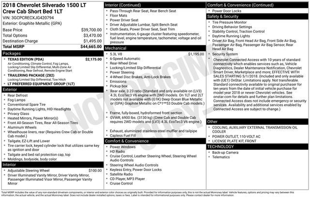This Silverado's impressive capabilities are further enhanced by its comprehensive suite of advanced safety and technology features, including OnStar, Chevrolet Connected Services, and a 4.2-inch diagonal color driver information center. With its potent powertrain, robust construction, and comprehensive list of amenities, the 2018 Chevrolet Silverado 1500 LT LT1 is the perfect choice for those seeking a capable, well-equipped, and versatile full-size pickup.