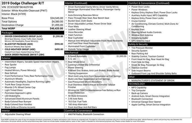 With its striking white exterior, this 2019 Dodge Challenger R/T is a true head-turner. Its bold, muscular styling is sure to turn heads wherever you go, while the impressive performance capabilities will have you craving the open road.