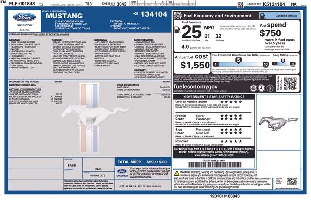Magnetic Metallic 2019 Ford Mustang EcoBoost RWD 10-Speed Automatic EcoBoost 2.3L I4 GTDi DOHC Turbocharged VCT WE DELIVER ANYWHERE, Ford Blue Advantage Blue Certified Certified, Equipment Group 100A, 4-Wheel Disc Brakes, 6 Speakers, ABS brakes, Air Conditioning, Alloy wheels, AM/FM radio, AM/FM Stereo, Auto-dimming Rear-View mirror, Brake assist, Bumpers: body-color, Compass, Delay-off headlights, Driver door bin, Driver vanity mirror, Dual front impact airbags, Dual front side impact airbags, Electronic Stability Control, Emergency communication system: 911 Assist, Exterior Parking Camera Rear, Four wheel independent suspension, Front anti-roll bar, Front Bucket Seats, Front Center Armrest, Front reading lights, Fully automatic headlights, Illuminated entry, Knee airbag, Leather Shift Knob, Low tire pressure warning, Occupant sensing airbag, Outside temperature display, Overhead airbag, Overhead console, Panic alarm, Passenger door bin, Passenger vanity mirror, Power door mirrors, Power steering, Power windows, Radio data system, Rear anti-roll bar, Rear window defroster, Remote keyless entry, Security system, Speed control, Speed-sensing steering, Speed-Sensitive Wipers, Split folding rear seat, Steering wheel mounted audio controls, SYNC Communications & Entertainment System, Tachometer, Telescoping steering wheel, Tilt steering wheel, Traction control, Trip computer, Variably intermittent wipers, Voltmeter, Wheels: 17 Sparkle Silver-Painted Aluminum, Equipment Group 100A.