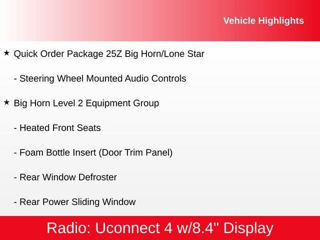 This well-equipped Ram 1500 is ready to take on any task with confidence. The Trailer Tow Group provides enhanced towing capabilities, while the Big Horn Level 2 Equipment Group offers a wealth of premium features, including the impressive Uconnect 4 system with an 8.4-inch touchscreen display, dual-zone climate control, and a host of convenience and connectivity technologies.