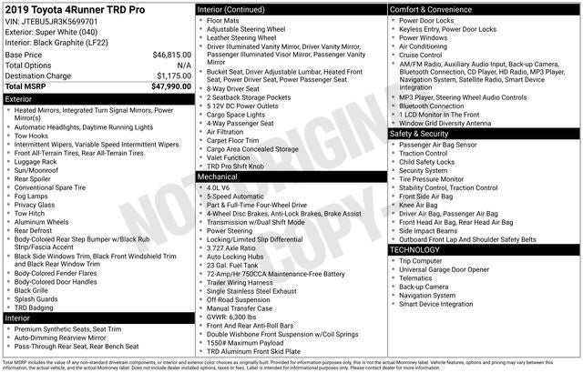 Super White 2019 Toyota 4Runner 4WD 5-Speed Automatic with Overdrive 4.0L V6 SMPI DOHC WE DELIVER ANYWHERE, 4WD, Black Graphite w/Nightshade Leather Seat Trim, Auto-Dimming Rear-View Mirror, Garage Door Opener, Power Tilt & Slide Moonroof w/Sunshade, TRD Badging, TRD Pro Floor Mats, TRD Pro Package, TRD Pro Shift Knob, TRD Roof Rack, TRD Suspension Kit, 3.727 Axle Ratio, 4-Wheel Disc Brakes, 8 Speakers, ABS brakes, Air Conditioning, Alloy wheels, AM/FM radio: SiriusXM, Anti-whiplash front head restraints, Auto-dimming Rear-View mirror, Brake assist, Bumpers: body-color, CD player, Compass, Driver door bin, Driver vanity mirror, Dual front impact airbags, Dual front side impact airbags, Electronic Stability Control, Emergency communication system: Safety Connect, Exterior Parking Camera Rear, Front anti-roll bar, Front Bucket Seats, Front Center Armrest, Front fog lights, Front reading lights, Front wheel independent suspension, Garage door transmitter: HomeLink, Heated door mirrors, Heated Front Bucket Seats, Heated front seats, Illuminated entry, Knee airbag, Leather Shift Knob, Low tire pressure warning, Navigation System, Occupant sensing airbag, Outside temperature display, Overhead airbag, Overhead console, Panic alarm, Passenger door bin, Passenger vanity mirror, Power door mirrors, Power driver seat, Power moonroof, Power passenger seat, Power steering, Power windows, Radio: Entune Premium Audio w/Navigation, Rear anti-roll bar, Rear seat center armrest, Rear window defroster, Rear window wiper, Remote keyless entry, Roof rack, Security system, Softex Synthetic Leather Seat Trim, Speed control, Speed-sensing steering, Split folding rear seat, Spoiler, Steering wheel mounted audio controls, Tachometer, Telescoping steering wheel, Tilt steering wheel, Traction control, Trip computer, Turn signal indicator mirrors, Variably intermittent wipers, Wheels: TRD 17 Matte Black Alloy, 4WD, Black Graphite w/Nightshade Leather Seat Trim, Auto-Dimming Rear-View Mirror, Garage Door Opener, Power Tilt & Slide Moonroof w/Sunshade, TRD Badging, TRD Pro Floor Mats, TRD Pro Package, TRD Pro Shift Knob, TRD Roof Rack, TRD Suspension Kit.