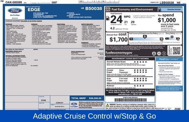 Oxford White 2020 Ford Edge SEL FWD 8-Speed Automatic EcoBoost 2.0L I4 GTDi DOHC Turbocharged VCT WE DELIVER ANYWHERE, Adaptive Cruise Control w/Stop & Go, Equipment Group 201A, Evasive Steering Assist, Ford Co-Pilot360 Assist+, Lane Centering, Voice-Activated Touchscreen Navigation System, 110V/150W AC Power Outlet, 3.80 Axle Ratio, 4-Wheel Disc Brakes, 9 Speakers, ABS brakes, ActiveX Seating Material Heated Bucket Seats, Air Conditioning, Alloy wheels, AM/FM radio: SiriusXM, Auto High-beam Headlights, Auto-dimming Rear-View mirror, Automatic temperature control, Brake assist, Bumpers: body-color, Compass, Delay-off headlights, Driver door bin, Driver vanity mirror, Dual front impact airbags, Dual front side impact airbags, Electronic Stability Control, Emergency communication system: SYNC 3 911 Assist, Foot-Activated Hands-Free Liftgate, FordPass Connect, Four wheel independent suspension, Front anti-roll bar, Front Bucket Seats, Front Center Armrest w/Storage, Front dual zone A/C, Front fog lights, Front reading lights, Fully automatic headlights, Heated door mirrors, Heated front seats, Illuminated entry, Knee airbag, Low tire pressure warning, Occupant sensing airbag, Outside temperature display, Overhead airbag, Overhead console, Panic alarm, Passenger door bin, Passenger vanity mirror, Perimeter Alarm, Power door mirrors, Power driver seat, Power passenger seat, Power steering, Power windows, Premium 9 Speaker Audio System, Radio: AM/FM Stereo/MP3 Capable, Rain sensing wipers, Rear anti-roll bar, Rear reading lights, Rear seat center armrest, Rear window defroster, Rear window wiper, Remote keyless entry, Remote Start System, Roof rack: rails only, SiriusXM Radio, SiriusXM Traffic & Travel Link, Speed control, Speed-Sensitive Wipers, Split folding rear seat, Spoiler, Steering wheel mounted audio controls, SYNC 3 Communications & Entertainment System, Tachometer, Telescoping steering wheel, Tilt steering wheel, Traction control, Trip computer, Turn signal indicator mirrors, Universal Garage Door Opener (UGDO), Variably intermittent wipers, Wireless Charging Pad, Adaptive Cruise Control w/Stop & Go, Equipment Group 201A, Evasive Steering Assist, Ford Co-Pilot360 Assist+, Lane Centering, Voice-Activated Touchscreen Navigation System.