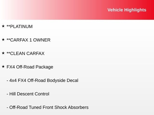 Powered by a robust 5.0L V8 engine and equipped with a smooth-shifting 10-speed automatic transmission and 4-wheel drive, this F-150 Platinum delivers exceptional performance and capability. Whether you're tackling rugged off-road terrain or towing heavy loads, this truck is up to the task. The FX4 Off-Road Package provides additional off-road-tuned suspension components, skid plates, and an electronic locking rear differential to ensure you conquer any challenge with confidence.