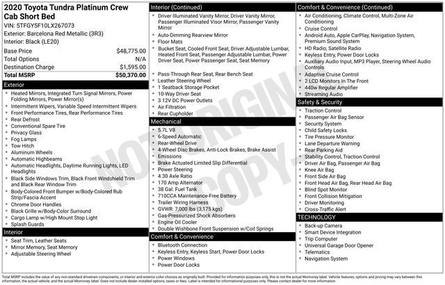 Whether you're looking for a capable work truck or a luxurious daily driver, this 2020 Toyota Tundra Platinum is a true standout in its class. With its impressive performance, premium features, and exceptional attention to detail, this truck is sure to exceed your expectations. We invite you to experience the power and refinement of this remarkable vehicle for yourself. Contact us today to schedule a test drive and discover why the Tundra Platinum is the ultimate choice for the discerning truck buyer.