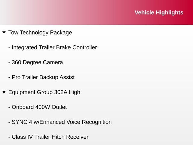 10-Way Power Driver & Passenger Seats, 360 Degree Camera, 8 Productivity Screen in Instrument Cluster, Accent-Color Step Bars, Black 2-Bar Style Grille w/Black Surround/Accents, Body-Color Door & Tailgate Handles, Body-Color Front & Rear Bumpers, Box Side Decals, Chrome Single-Tip Exhaust, Class IV Trailer Hitch Receiver, Connected Built-In Navigation, Dual Zone Automatic Temperature Control, Equipment Group 302A High, Evasive Steering Assist, Ford Co-Pilot360 Assist 2.0, Heated Front Seats, Integrated Trailer Brake Controller, Intelligent Access w/Push Button Start, Intelligent Adaptive Cruise Control w/Stop & Go, Intersection Assist, Leather-Wrapped Steering Wheel, LED Box Lighting w/Zone Lighting, LED Reflector Headlamps, LED Sideview Mirror Spotlights, Onboard 400W Outlet, Power Glass Heated Sideview Mirrors, Pro Trailer Backup Assist, Rear Under-Seat Storage, Remote Start System w/Remote Tailgate Release, SYNC 4 w/Enhanced Voice Recognition, Tow Technology Package, Unique Sport Cloth 40/Console/40 Front-Seats, Wheels: 20 6-Spoke Dark Alloy Painted Aluminum, XLT Sport Appearance Package, 3.55 Axle Ratio, 4-Wheel Disc Brakes, 6 Speakers, ABS brakes, Air Conditioning, Alloy wheels, AM/FM radio, Auto High-beam Headlights, Auto-Dimming Rear-View Mirror, Brake assist, Bumpers: chrome, Cloth 40/20/40 Front Seat, Compass, Delay-off headlights, Driver door bin, Driver vanity mirror, Dual front impact airbags, Dual front side impact airbags, Electronic Stability Control, Emergency communication system: SYNC 4 911 Assist, Exterior Parking Camera Rear, Front anti-roll bar, Front Center Armrest w/Storage, Front fog lights, Front reading lights, Front wheel independent suspension, Fully automatic headlights, Heated door mirrors, Illuminated entry, Low tire pressure warning, Occupant sensing airbag, Outside temperature display, Overhead airbag, Overhead console, Panic alarm, Passenger door bin, Passenger vanity mirror, Power door mirrors, Power steering, Power windows, Radio data system, Radio: AM/FM SiriusXM w/360L, Radio: AM/FM Stereo w/6 Speakers, Rear reading lights, Rear step bumper, Rear window defroster, Remote keyless entry, Security system, Speed control, Speed Sign Recognition, Speed-sensing steering, Split folding rear seat, Steering wheel mounted audio controls, SYNC 4, Tachometer, Tailgate Step w/Tailgate Work Surface, Telescoping steering wheel, Tilt steering wheel, Traction control, Trip computer, Variably intermittent wipers, Voltmeter, 10-Way Power Driver & Passenger Seats, 360 Degree Camera, 8 Productivity Screen in Instrument Cluster, Accent-Color Step Bars, Black 2-Bar Style Grille w/Black Surround/Accents, Body-Color Door & Tailgate Handles, Body-Color Front & Rear Bumpers, Box Side Decals, Chrome Single-Tip Exhaust, Class IV Trailer Hitch Receiver, Connected Built-In Navigation, Dual Zone Automatic Temperature Control, Equipment Group 302A High, Evasive Steering Assist, Ford Co-Pilot360 Assist 2.0, Heated Front Seats, Integrated Trailer Brake Controller, Intelligent Access w/Push Button Start, Intelligent Adaptive Cruise Control w/Stop & Go, Intersection Assist, Leather-Wrapped Steering Wheel, LED Box Lighting w/Zone Lighting, LED Reflector Headlamps, LED Sideview Mirror Spotlights, Onboard 400W Outlet, Power Glass Heated Sideview Mirrors, Pro Trailer Backup Assist, Rear Under-Seat Storage, Remote Start System w/Remote Tailgate Release, SYNC 4 w/Enhanced Voice Recognition, Tow Technology Package, Unique Sport Cloth 40/Console/40 Front-Seats, Wheels: 20 6-Spoke Dark Alloy Painted Aluminum, XLT Sport Appearance Package.
