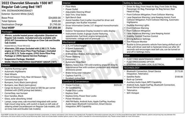 2 Speakers, 2-Speaker Audio System, 220 Amp Alternator, 3.42 Rear Axle Ratio, 3.5 Monochromatic Display Driver Info Center, 4-Wheel Disc Brakes, 40/20/40 Front Split Bench Seat, ABS brakes, Air Conditioning, AM/FM radio, Apple CarPlay/Android Auto, Auto High-beam Headlights, Automatic Emergency Braking, Black (Semi-Gloss) Front Bumper, Black (Semi-Gloss) Rear Bumper, Bluetooth® For Phone, Brake assist, Chevrolet Connected Access Capable, Compass, Delay-off headlights, Driver door bin, Dual front impact airbags, Dual front side impact airbags, Electrical Steering Column Lock, Electronic Cruise Control, Electronic Stability Control, Following Distance Indicator, Forward Collision Alert, Front anti-roll bar, Front Center Armrest w/Storage, Front Pedestrian Braking, Front reading lights, Front wheel independent suspension, Fully automatic headlights, HD Rear Vision Camera, Heated door mirrors, Heated Power-Adjustable Outside Mirrors, Illuminated entry, Inside Rear-View Mirror w/Tilt, IntelliBeam Automatic High Beam On/Off, Lane Keep Assist w/Lane Departure Warning, Locking Tailgate, Low tire pressure warning, Manual Tailgate Function w/No EZ Lift, Manual Tilt Wheel Steering Column, Occupant sensing airbag, OnStar & Chevrolet Connected Services Capable, Outside temperature display, Overhead airbag, Overhead console, Panic alarm, Passenger door bin, Passenger vanity mirror, Power door mirrors, Power Front Windows w/Driver Express Up/Down, Power Front Windows w/Passenger Express Down, Power steering, Power windows, Preferred Equipment Group 1WT, Premium audio system: Chevrolet Infotainment 3, Radio data system, Radio: Chevrolet Infotainment 3 System, Rear reading lights, Rear step bumper, Remote Keyless Entry, Remote keyless entry, Rubberized-Vinyl Floor Covering, SiriusXM Radio, Solar Absorbing Tinted Glass, Speed-sensing steering, Standard Suspension Package, Standard Tailgate, Tachometer, Tilt steering wheel, Traction control, Trip computer, Variably intermittent wipers, Vinyl Seat Trim, Voltmeter, Wheels: 17 x 8 Ultra Silver Painted Steel, Wi-Fi Hot Spot Capable, Wireless Phone Projection.