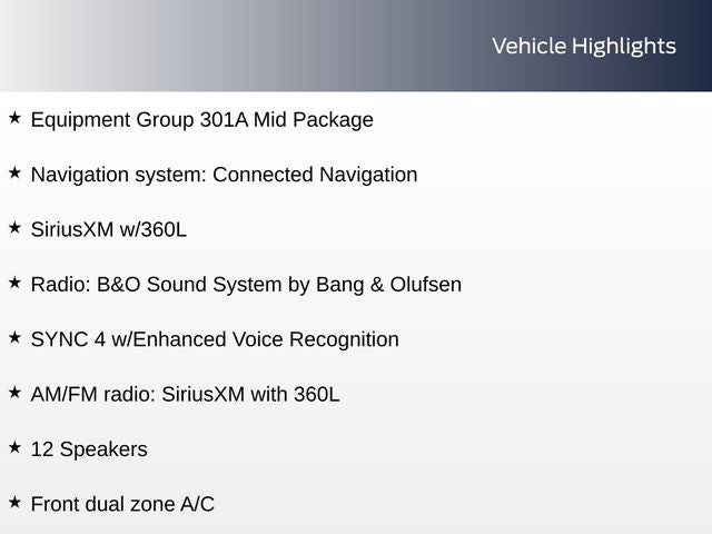 - Radio: B&O Sound System by Bang & Olufsen -inc: speed-compensated volume, HD Radio, AM/FM stereo, MP3 capability, 12 speakers, connected navigation w/90-day trial, pinch-to-zoom capability, live traffic, predictive destinations and route guidance and one box search