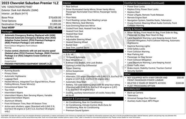Boasting a stunning Gray exterior, the Suburban Premier is equipped with a suite of premium features that cater to your every need: - Preferred Equipment Group 1LZ - Navigation System - Bose 10-Speaker Surround w/CenterPoint - SiriusXM Radio w/360L - Automatic temperature control - Rear air conditioning - Enhanced Driver Information Center - Hands-Free Rear Power Programmable Liftgate - Memory Settings - Remote Start - Universal Home Remote - Wrapped Steering Wheel.