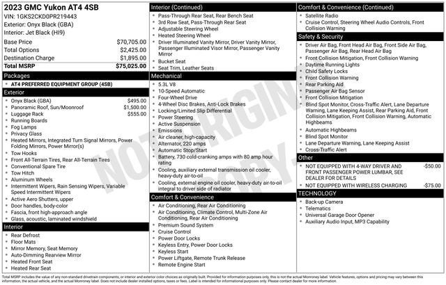 2 Presets For Outside Rearview Mirrors, 3 Years of GMC Connected Services, 3 Years of OnStar Safety & Security, 3 Years of OnStar Safety & Security (DISC), 3.23 Rear Axle Ratio, 3rd Row 60/40 Power-Folding Split-Bench Seat, 3rd row seats: split-bench, 4-Wheel Disc Brakes, 9 Speakers, ABS brakes, Adaptive suspension, Air Conditioning, Alloy wheels, AM/FM radio: SiriusXM with 360L, AM/FM Stereo, Apple CarPlay/Android Auto, Auto High-beam Headlights, Auto-dimming door mirrors, Auto-dimming Rear-View mirror, Auto-leveling suspension, Automatic Emergency Braking, Automatic temperature control, Black Roof Rack Cross Rails, Black Roof-Mounted Luggage Rack Side Rails, Bose 9-Speaker Stereo Audio System Feature, Brake assist, Bright Front & Rear Door Sill Plates, Bumpers: body-color, Compass, Delay-off headlights, Driver door bin, Driver vanity mirror, Dual front impact airbags, Dual front side impact airbags, Dual-Pane Panoramic Power Sunroof, Electronic Stability Control, Emergency communication system: OnStar and GMC connected services capable, Following Distance Indicator, Forward Collision Alert, Four wheel independent suspension, Front & Rear Park Assist, Front anti-roll bar, Front Bucket Seats, Front Center Armrest, Front dual zone A/C, Front fog lights, Front High-Approach Angle Fascia, Front Pedestrian Braking, Front reading lights, Fully automatic headlights, Garage door transmitter, Hands-Free Power Programmable Rear Liftgate, Heated & Ventilated Driver & Front Passenger Seats, Heated 2nd Row Outboard Position Seats, Heated door mirrors, Heated Driver & Front Passenger Seats, Heated front seats, Heated rear seats, Heated Steering Wheel, Heated steering wheel, Heavy-Duty Air Filter, Hill Descent Control, Illuminated entry, Inside Rear-View Auto-Dimming Mirror, IntelliBeam Automatic High Beam On/Off, Lane Change Alert w/Side Blind Zone Alert, Lane Keep Assist w/Lane Departure Warning, Low tire pressure warning, Magnetic Ride Control Suspension, Memory seat, Navigation System, Not Equipped w/4-Way Driver & Fr Pass Pwr Lumbar, Not Equipped w/Wireless Charging, Occupant sensing airbag, Outside Heated Power-Adjustable Mirrors, Outside temperature display, Overhead airbag, Overhead console, Panic alarm, Passenger door bin, Passenger vanity mirror, Perforated Leather Seating Surfaces, Power door mirrors, Power driver seat, Power Liftgate, Power passenger seat, Power Release 2nd Row 60/40 Split-Folding Bench Seat, Power steering, Power Tilt & Telescopic Steering Column, Power windows, Preferred Equipment Group 4SB, Rain sensing wipers, Rear air conditioning, Rear anti-roll bar, Rear Cross Traffic Alert, Rear reading lights, Rear seat center armrest, Rear window defroster, Rear window wiper, Red Horizontal-Mounted Recovery Hooks, Remote keyless entry, Roof rack: rails only, Safety Alert Seat, Security system, SiriusXM w/360L, Speed control, Speed-sensing steering, Split folding rear seat, Spoiler, Steering wheel memory, Steering wheel mounted audio controls, Tachometer, Telescoping steering wheel, Tilt steering wheel, Traction control, Trip computer, Turn signal indicator mirrors, Universal Home Remote, Variably intermittent wipers, Ventilated front seats, Voltmeter, Wheels: 20 x 9 6-Spoke Machined Aluminum, Wireless Charging.