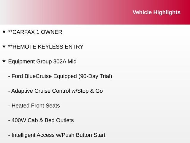 **CARFAX 1 OWNER, 400W Cab & Bed Outlets, 4x4 FX4 Off-Road Bodyside Decal, Adaptive Cruise Control w/Stop & Go, Cloth 40/Console/40 Front Seats, Console Worksurface, Equipment Group 302A Mid, Ford BlueCruise Equipped (90-Day Trial), FX4 Off-Road Package, Heated Front Seats, Hill Descent Control, Integrated Trailer Brake Controller, Intelligent Access w/Push Button Start, Mobile Office Package, Monotube Rear Shocks, Navigation system: Connected Navigation, Off-Road Tuned Front Shock Absorbers, Partitioned Lockable Rear Storage, Power Glass Heated Sideview Mirrors, Power-Sliding Rear Window, Remote Start System w/Remote Tailgate Release, Rock Crawl Mode, Tow/Haul Package, Tray Style Floor Liner, 4-Wheel Disc Brakes, 6 Speakers, ABS brakes, Air Conditioning, Alloy wheels, AM/FM radio: SiriusXM with 360L, Auto High-beam Headlights, Auto-dimming Rear-View mirror, Automatic temperature control, Brake assist, Bumpers: chrome, Chrome wheels, Cloth 40/20/40 Front Seat, Compass, Delay-off headlights, Driver door bin, Driver vanity mirror, Dual front impact airbags, Dual front side impact airbags, Electronic Stability Control, Emergency communication system: SYNC 4 911 Assist, Front anti-roll bar, Front Center Armrest w/Storage, Front dual zone A/C, Front fog lights, Front License Plate Bracket, Front reading lights, Front wheel independent suspension, Fully automatic headlights, Heated door mirrors, Illuminated entry, Low tire pressure warning, Occupant sensing airbag, Outside temperature display, Overhead airbag, Overhead console, Panic alarm, Passenger door bin, Passenger vanity mirror, Power door mirrors, Power driver seat, Power steering, Power windows, Radio data system, Radio: AM/FM SiriusXM w/360L, Rear reading lights, Rear step bumper, Rear window defroster, Remote keyless entry, Security system, Speed control, Split folding rear seat, Steering wheel mounted audio controls, SYNC 4 w/Enhanced Voice Recognition, Tachometer, Telescoping steering wheel, Tilt steering wheel, Traction control, Trip computer, Variably intermittent wipers, Voltmeter, Wheels: 18 Chrome-Like PVD, 400W Cab & Bed Outlets, 4x4 FX4 Off-Road Bodyside Decal, Adaptive Cruise Control w/Stop & Go, Cloth 40/Console/40 Front Seats, Console Worksurface, Equipment Group 302A Mid, Ford BlueCruise Equipped (90-Day Trial), FX4 Off-Road Package, Heated Front Seats, Hill Descent Control, Integrated Trailer Brake Controller, Intelligent Access w/Push Button Start, Mobile Office Package, Monotube Rear Shocks, Navigation system: Connected Navigation, Off-Road Tuned Front Shock Absorbers, Partitioned Lockable Rear Storage, Power Glass Heated Sideview Mirrors, Power-Sliding Rear Window, Remote Start System w/Remote Tailgate Release, Rock Crawl Mode, Tow/Haul Package, Tray Style Floor Liner.