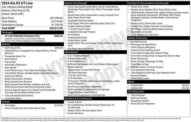 Powered by a spirited 1.6L I4 DGI Turbocharged engine, this K5 GT-Line delivers an exhilarating 180 horsepower, seamlessly channeled through an 8-Speed Automatic transmission. With an impressive EPA-estimated 27 city/37 highway MPG, you'll enjoy exceptional efficiency and a thrilling driving experience.