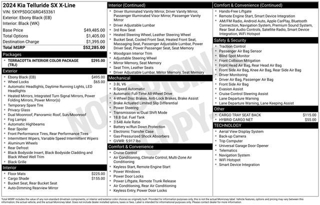 Boasting a striking Ebony Black exterior and a stunning Terracotta interior color package, the Telluride SX X-Line commands attention wherever it goes. Equipped with a robust 3.8L V6 DOHC engine and an advanced 8-speed automatic transmission with all-wheel drive, this SUV delivers exceptional performance and confident handling, ensuring a smooth and thrilling ride.