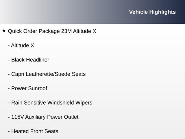 Beyond its impressive performance, the Altitude X pampers you with an array of premium features. Enjoy the convenience of a Power Liftgate, the comfort of Heated Front Seats and a Heated Steering Wheel, and the connectivity of the Uconnect 5 infotainment system with an 8.4 display. The Altitude X also boasts a sleek, distinctive appearance with Gloss Black Exterior Accents and 18 Fully Painted Aluminum wheels.