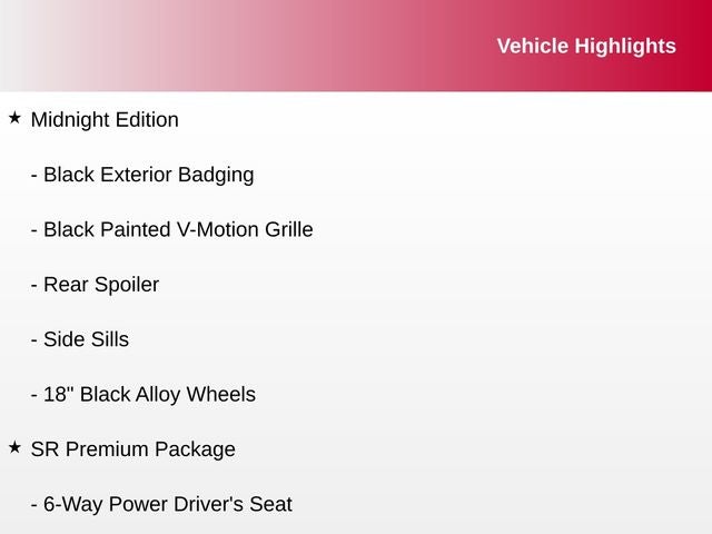 18 Black Alloy Wheels, 6-Way Power Driver's Seat, Black Exterior Badging, Black Painted V-Motion Grille, Bose Premium Audio System with 8 Speakers, Intelligent Around View Monitor (I-AVM), Leather Heated Steering Wheel, Leatherette Seat Trim, Midnight Edition, NissanConnect Services, Power Sliding Glass Moonroof with Tilt Feature, Rear Spoiler, Side Sills, SR Premium Package, Sunvisors with Illuminated Vanity Mirrors, Wi-Fi Hotspot, 18 Alloy Wheels, 2-Tone Premium Paint, 4-Wheel Disc Brakes, 8 Speakers, ABS brakes, Air Conditioning, Alloy wheels, AM/FM radio: SiriusXM, Auto High-beam Headlights, Automatic temperature control, Blind Spot Warning, Brake assist, Bumpers: body-color, Carpeted Floor Mats with Trunk Mat, Delay-off headlights, Driver door bin, Driver vanity mirror, Dual front impact airbags, Dual front side impact airbags, Electronic Stability Control, External Ground Lighting with Logo, Four wheel independent suspension, Front anti-roll bar, Front Bucket Seats, Front Center Armrest, Front dual zone A/C, Front reading lights, Fully automatic headlights, Heated door mirrors, Heated Front Bucket Seats, HEATED FRONT SEATS, Illuminated entry, Interior Ambient Lighting, Knee airbag, Leather Shift Knob, Lighting Package, Low tire pressure warning, NissanConnect featuring Apple CarPlay and Android Auto, Occupant sensing airbag, Outside temperature display, Overhead airbag, Overhead console, Panic alarm, Passenger door bin, Passenger vanity mirror, Power door mirrors, Power steering, Power windows, Radio data system, Radio: AM/FM with RDS/MP3/Aux-in, Rear anti-roll bar, Rear Parking Sensors, Rear seat center armrest, Rear side impact airbag, Rear window defroster, Remote keyless entry, Security system, Speed control, Speed-sensing steering, Split folding rear seat, Spoiler, Sport Cloth Seat Trim, Steering wheel mounted audio controls, Tachometer, Telescoping steering wheel, Tilt steering wheel, Traction control, Trip computer, Turn signal indicator mirrors, Variably intermittent wipers, 18 Black Alloy Wheels, 6-Way Power Driver's Seat, Black Exterior Badging, Black Painted V-Motion Grille, Bose Premium Audio System with 8 Speakers, Intelligent Around View Monitor (I-AVM), Leather Heated Steering Wheel, Leatherette Seat Trim, Midnight Edition, NissanConnect Services, Power Sliding Glass Moonroof with Tilt Feature, Rear Spoiler, Side Sills, SR Premium Package, Sunvisors with Illuminated Vanity Mirrors, Wi-Fi Hotspot.